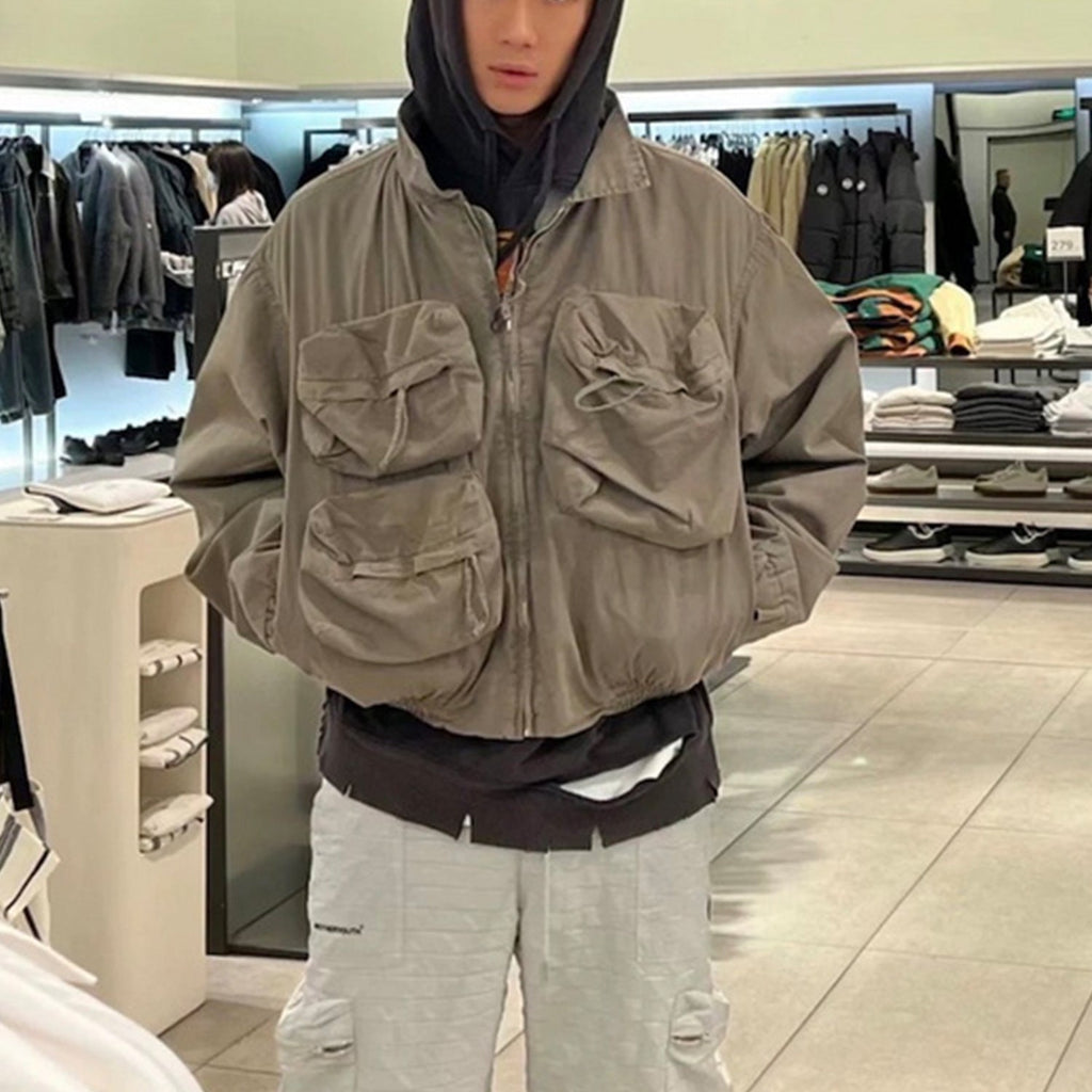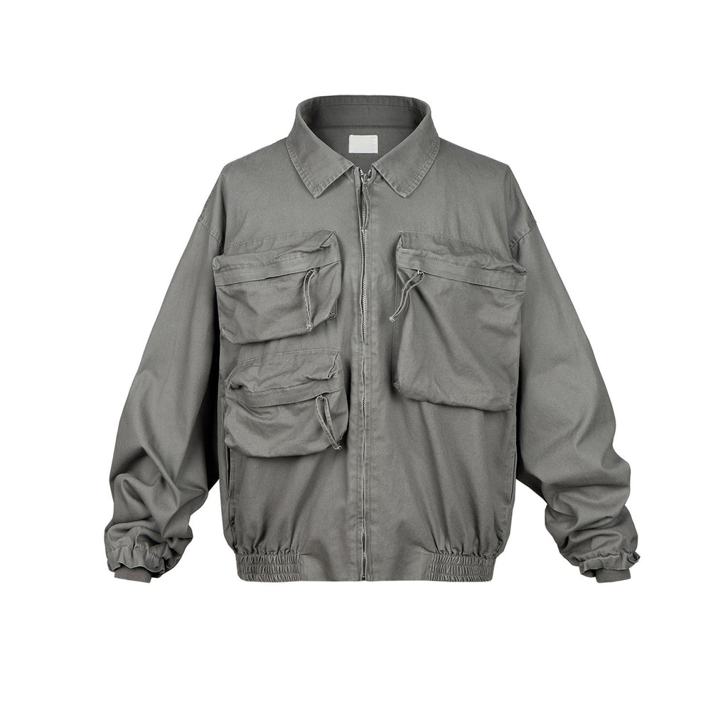MIJKO Mens Jacket Multi Pocket Lapel Zip Mainstream Fashion Jacket