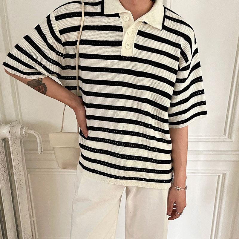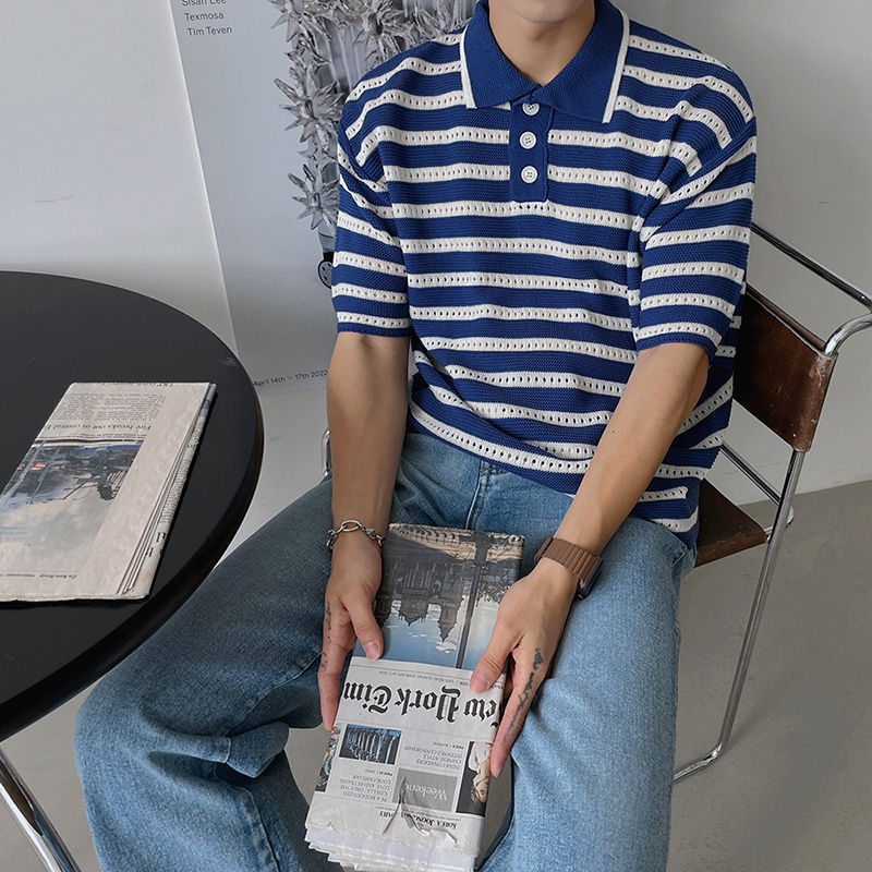 Mariner Shirt Striped Short-Sleeved Polo Shirt Men's Korean-Style Trendy Summer Loose Lapels T-shirt