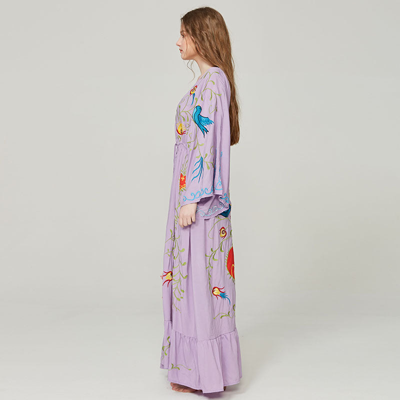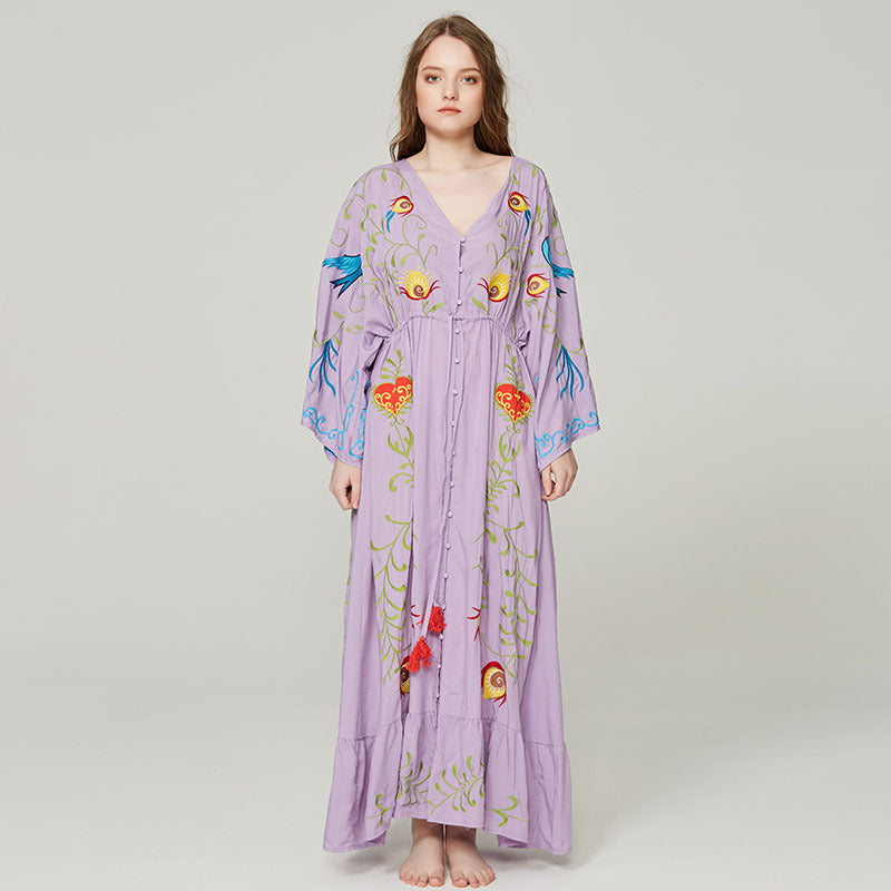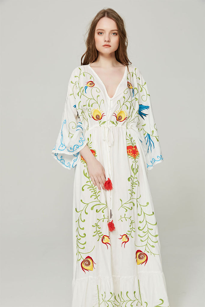 Beth Dutton Bohemian Dress Winter Autumn Maxi Dresses Flowers Embroidered V-neck