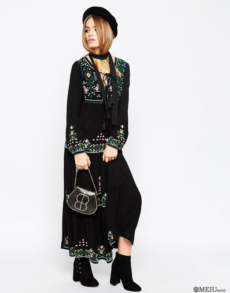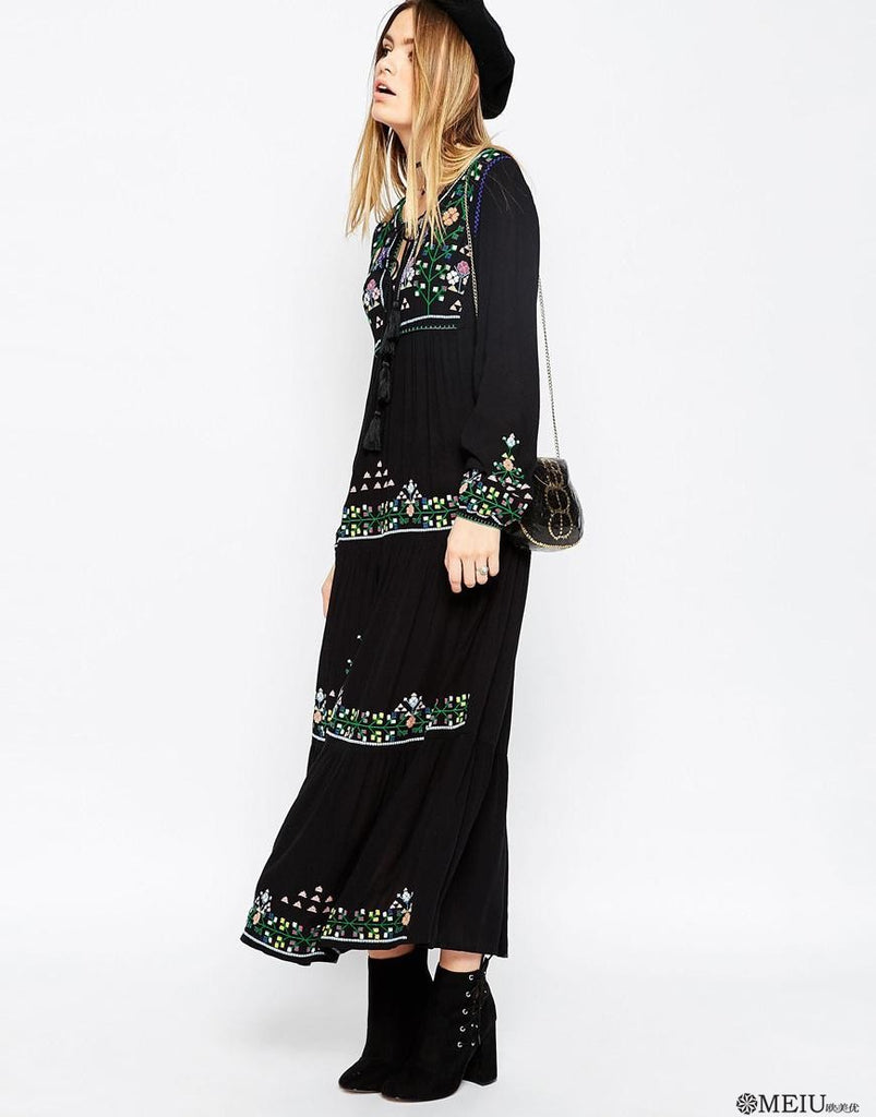 Beth Dutton Bohemian Dress Winter Autumn Maxi Dresses Solid Color Embroidery Pattern Self-Tie Dress