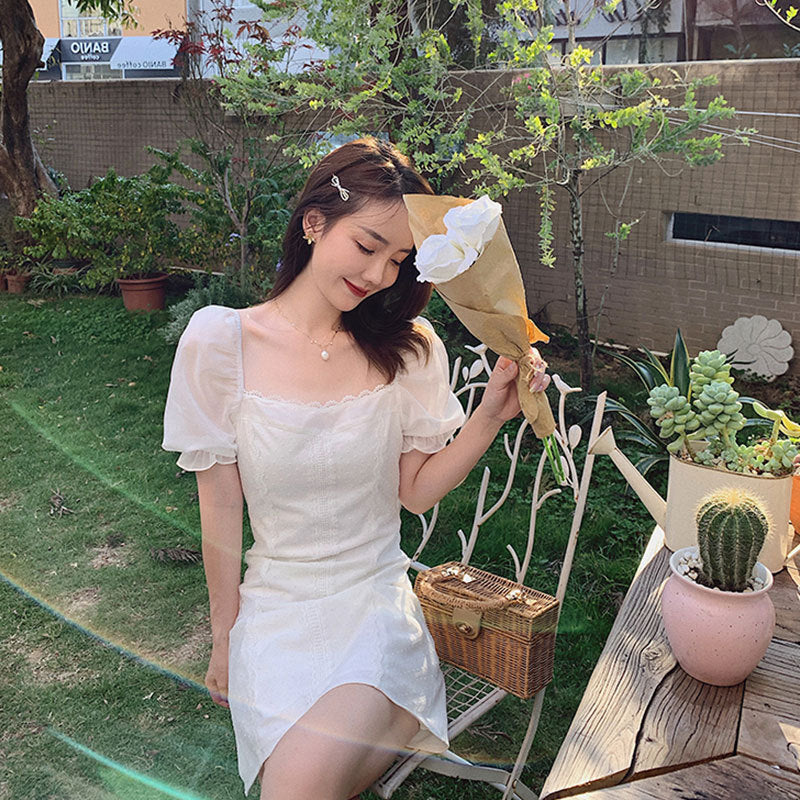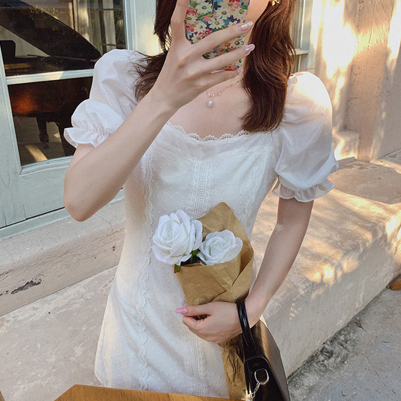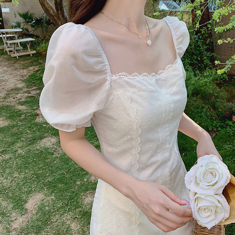 Regency Dress White Puff Sleeve Square Collar Lace