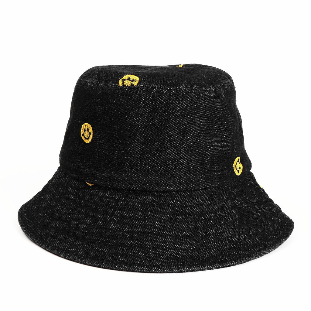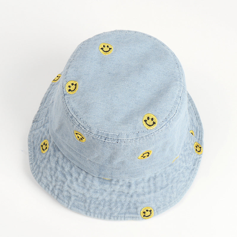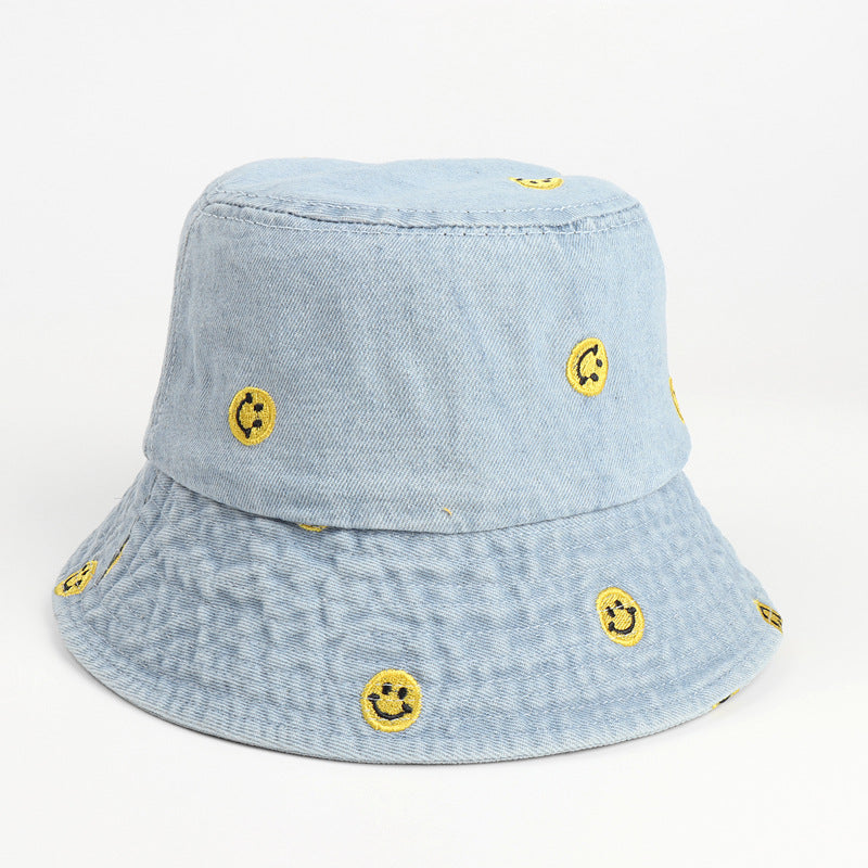 Denim Bucket Hat Fishing Cap Cotton Print Fisherman Hat Smiley Face Women's Fashion Embroidered Retro Sun Hat