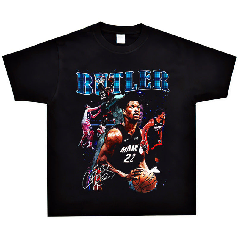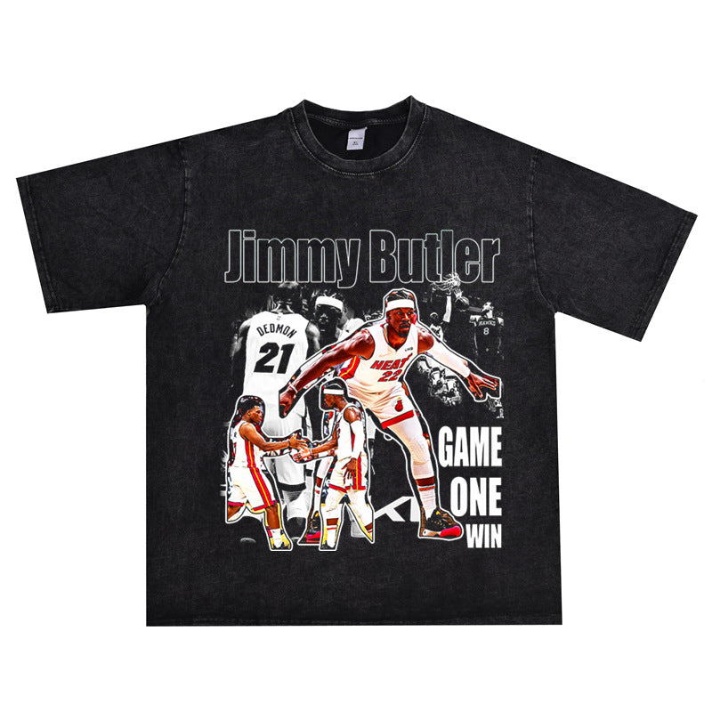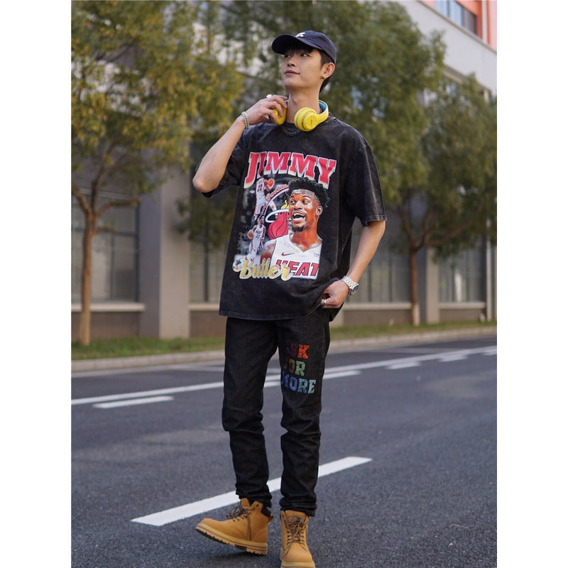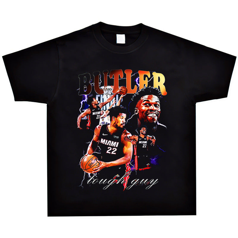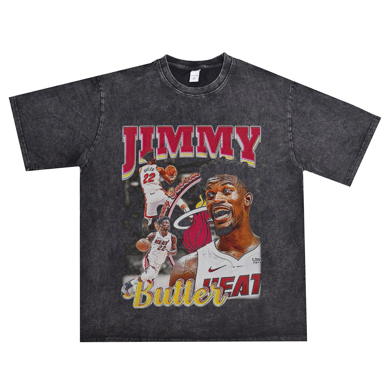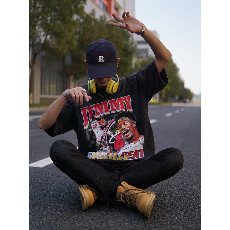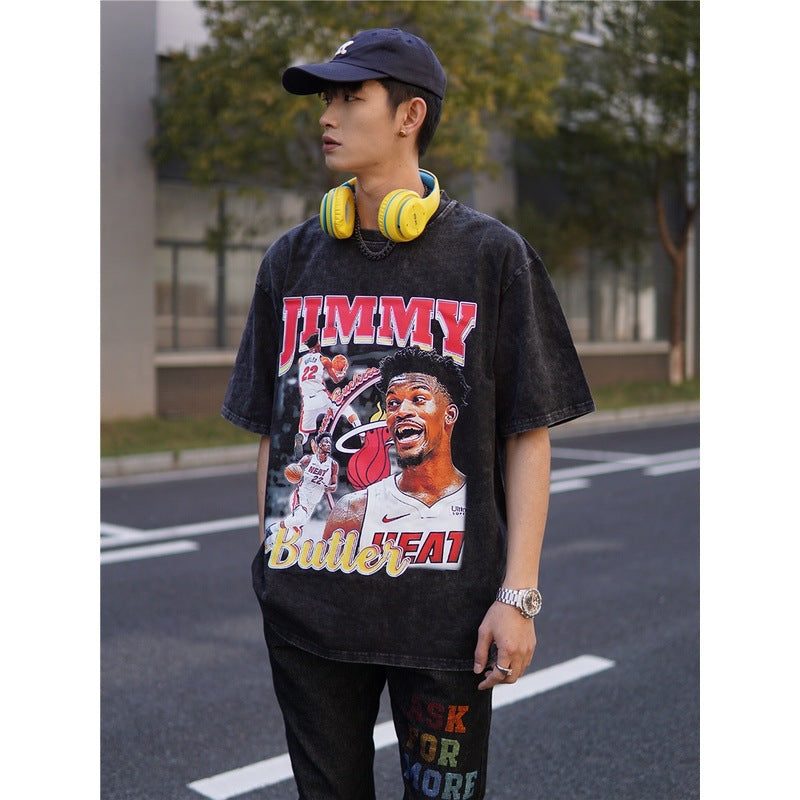 Basket Ball Star T Shirt Jimmy Butler Printed Washed Distressed T-shirt Cotton Short Sleeve round Neck
