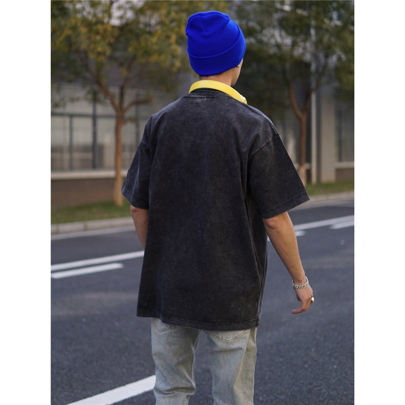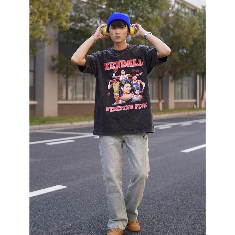 Basket Ball Star T Shirt Starting Five Retro Washed Distressed T-shirt Short Sleeve Loose Men and Women