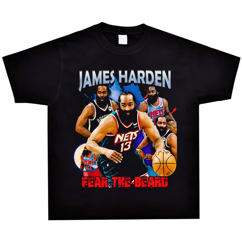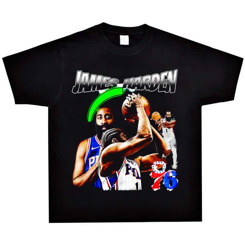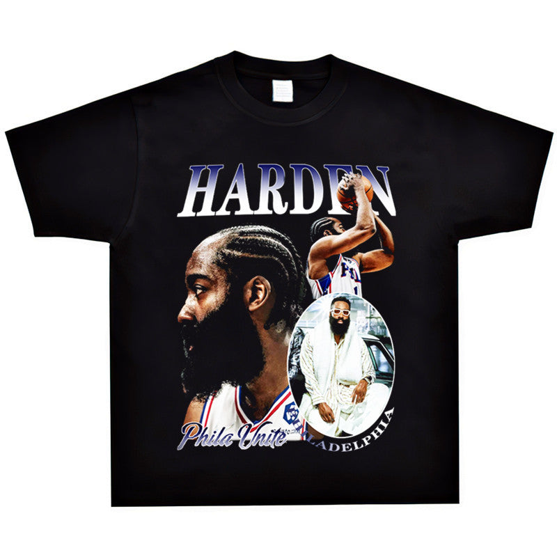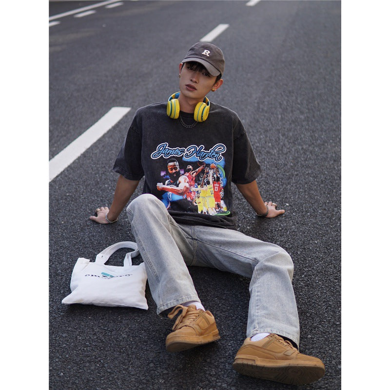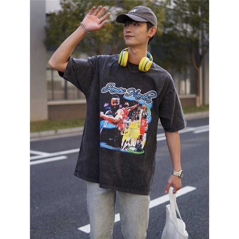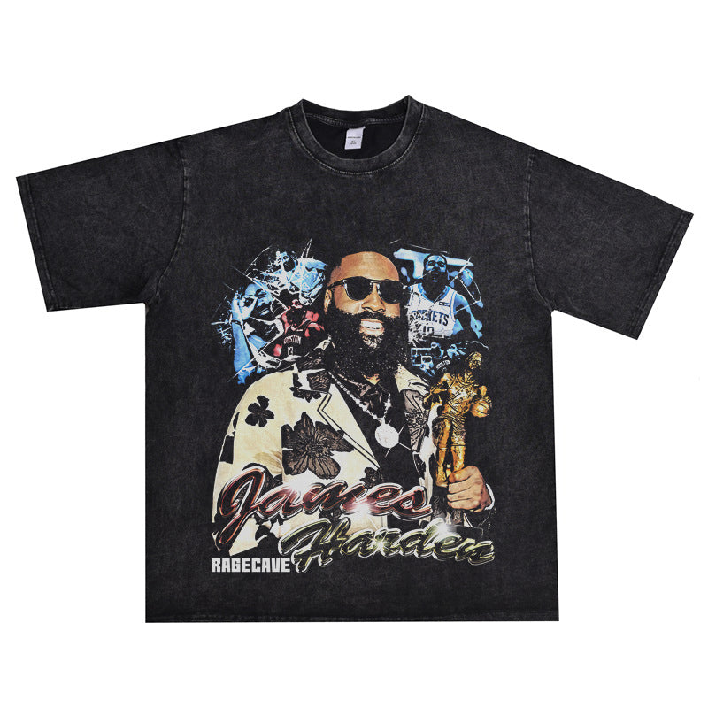 Basket Ball Star T Shirt Basketball Washed Distressed James Harden Printed T-shirt Retro Short Sleeve Cotton