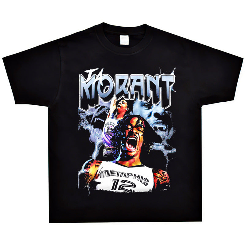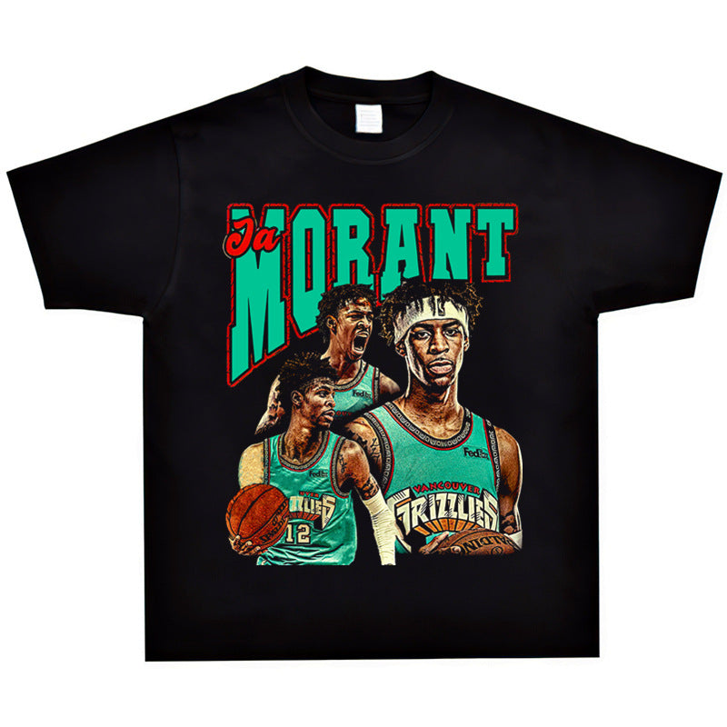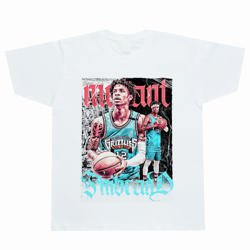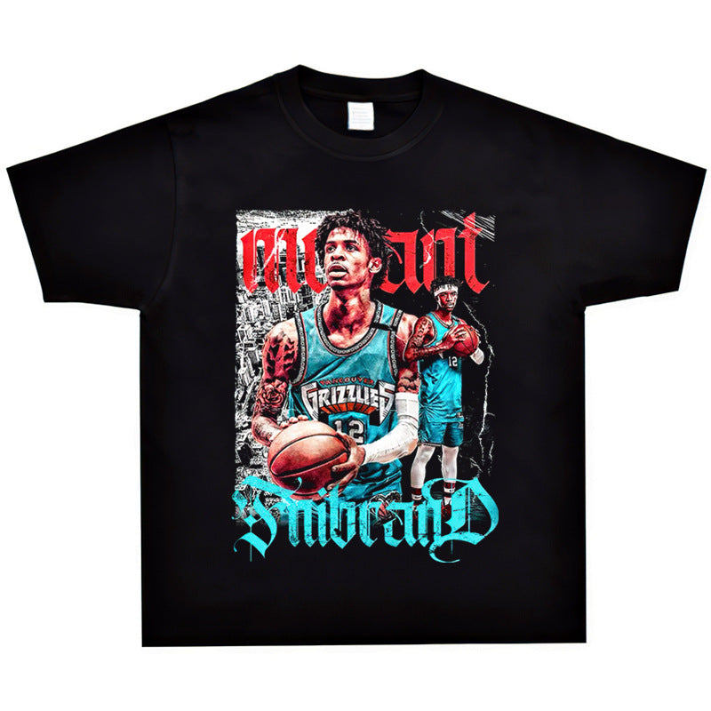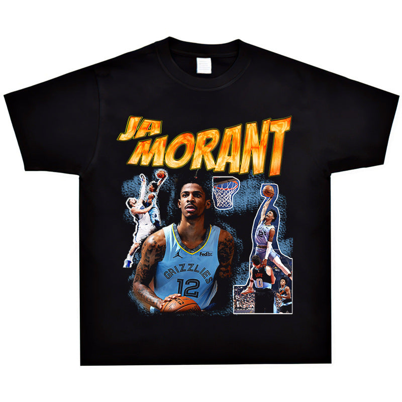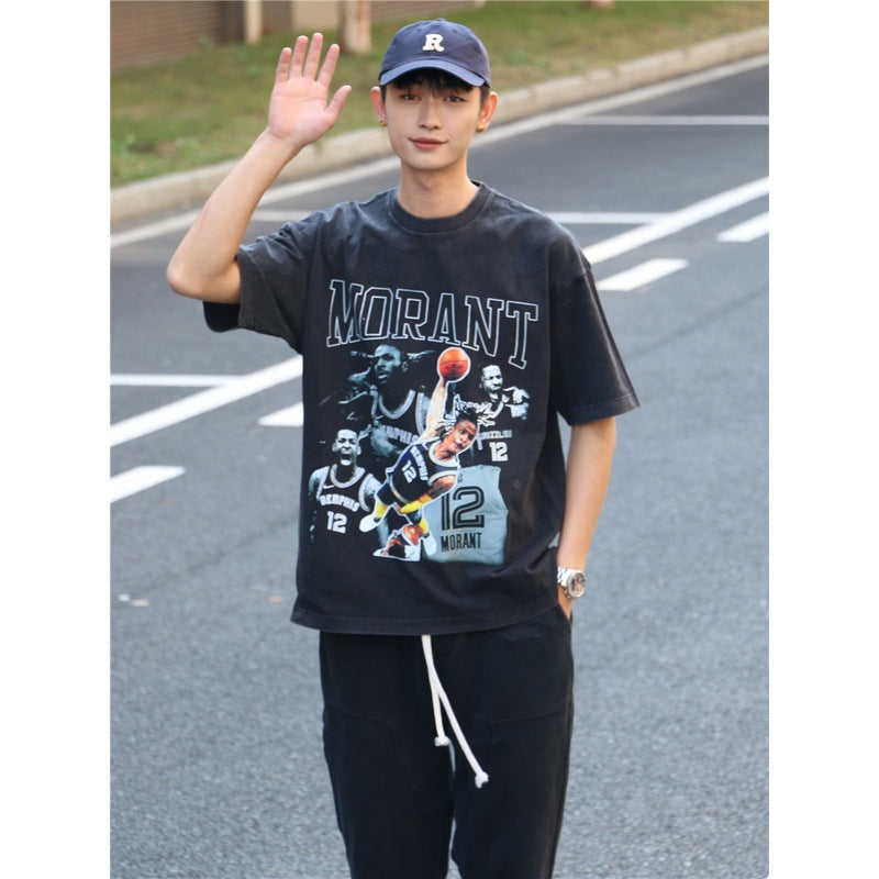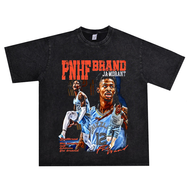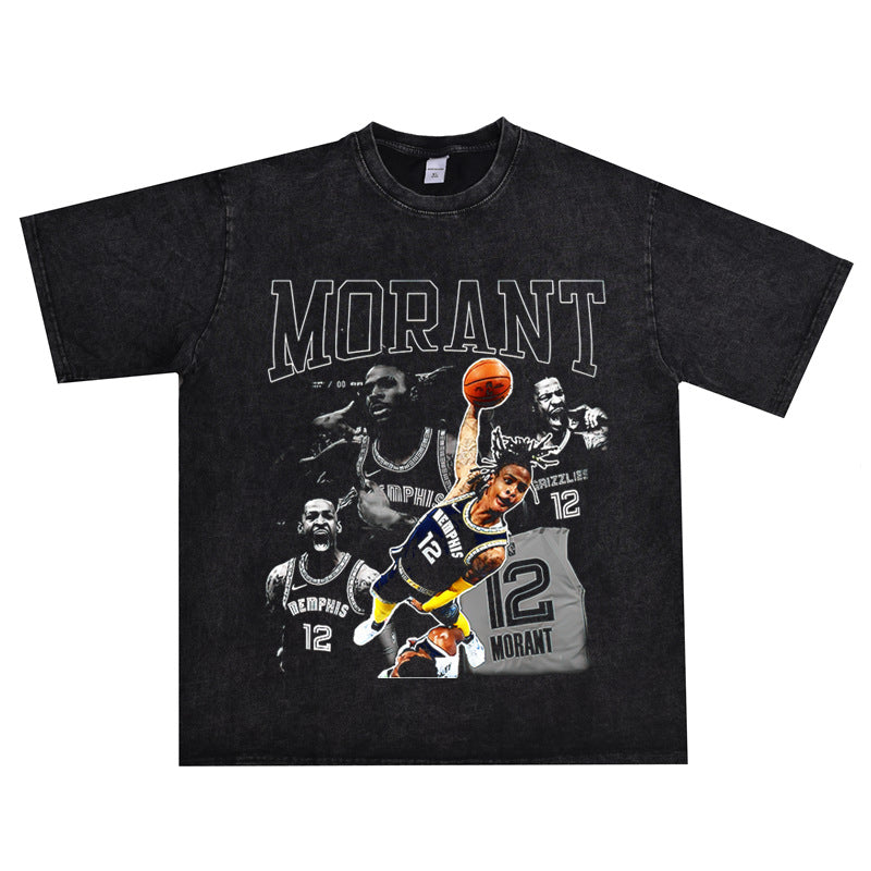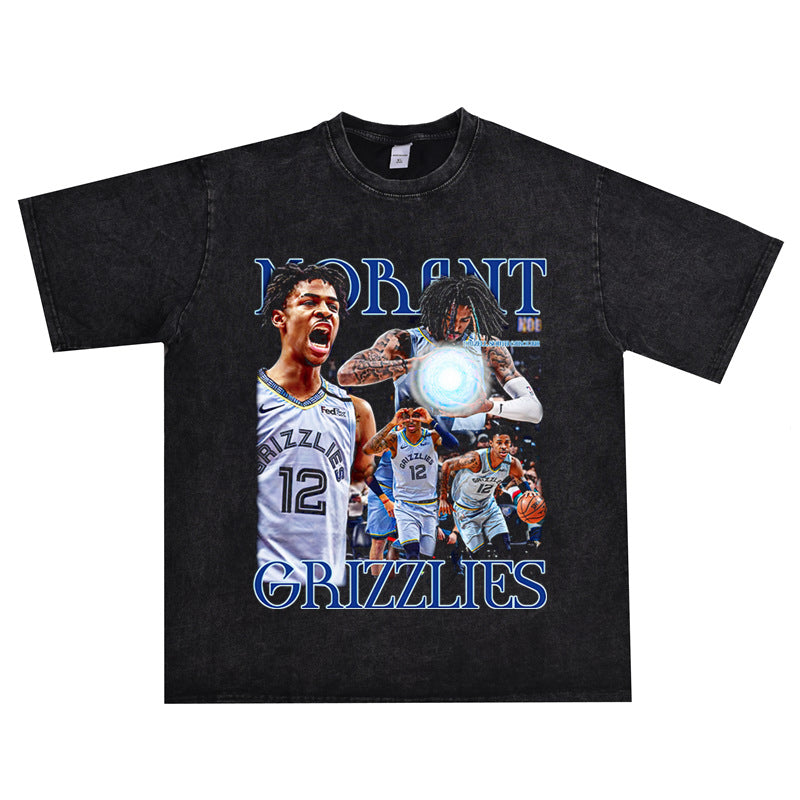 Basket Ball Star T Shirt Basketball Ja Morant Printed Washed Distressed T-Shirt Cotton Short Sleeve Loose