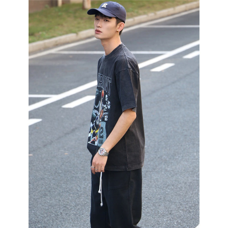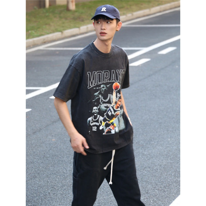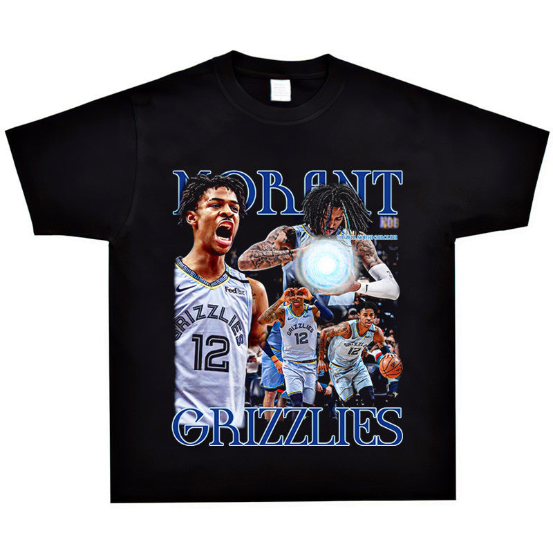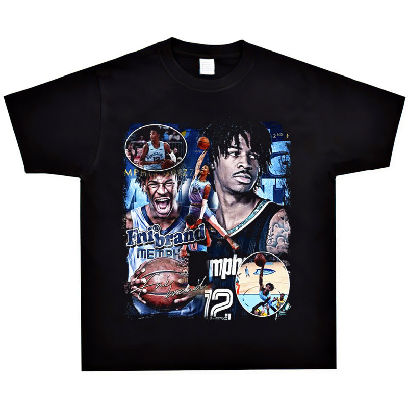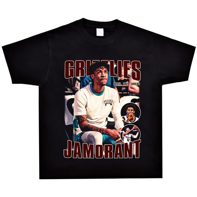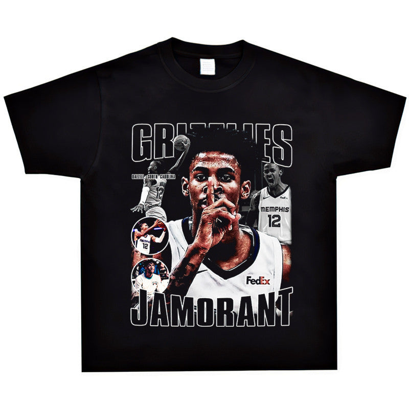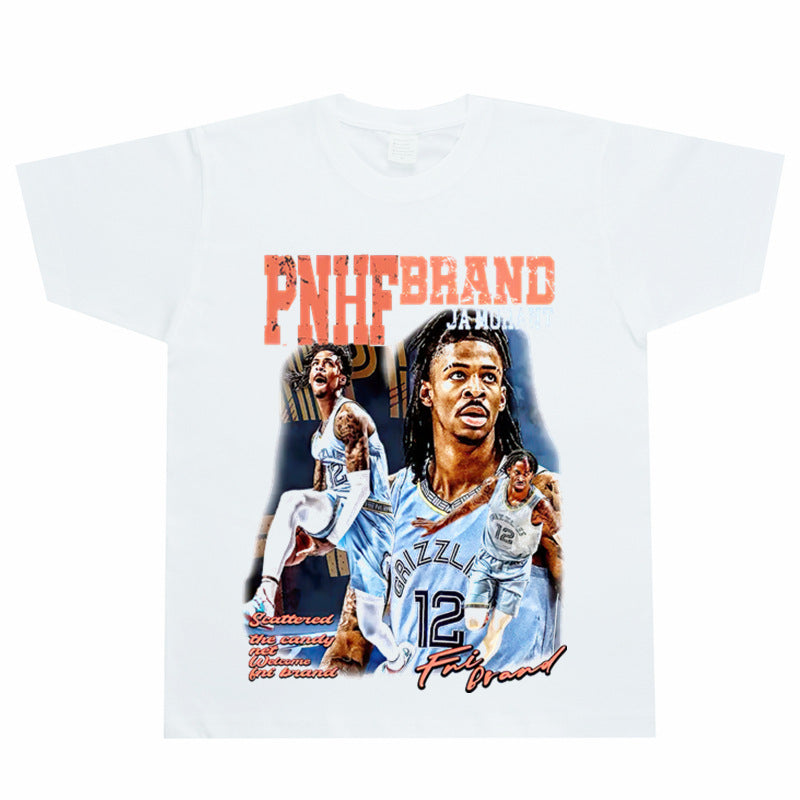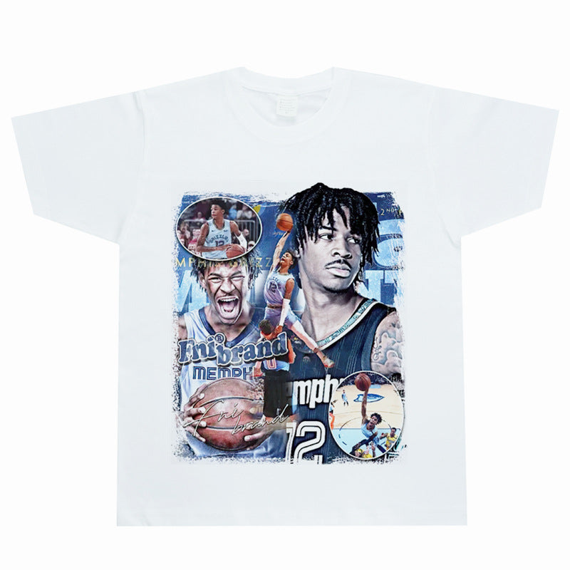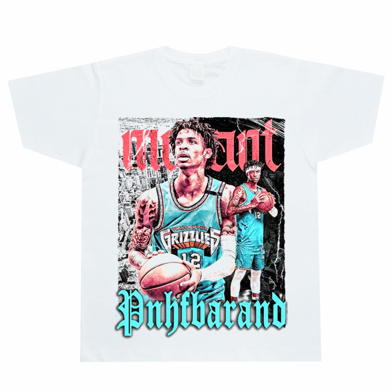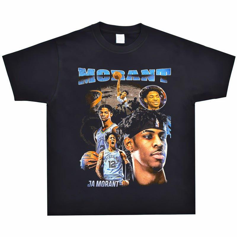 Basket Ball Star T Shirt Basketball Ja Morant Printed Washed Distressed T-Shirt Cotton Short Sleeve Loose