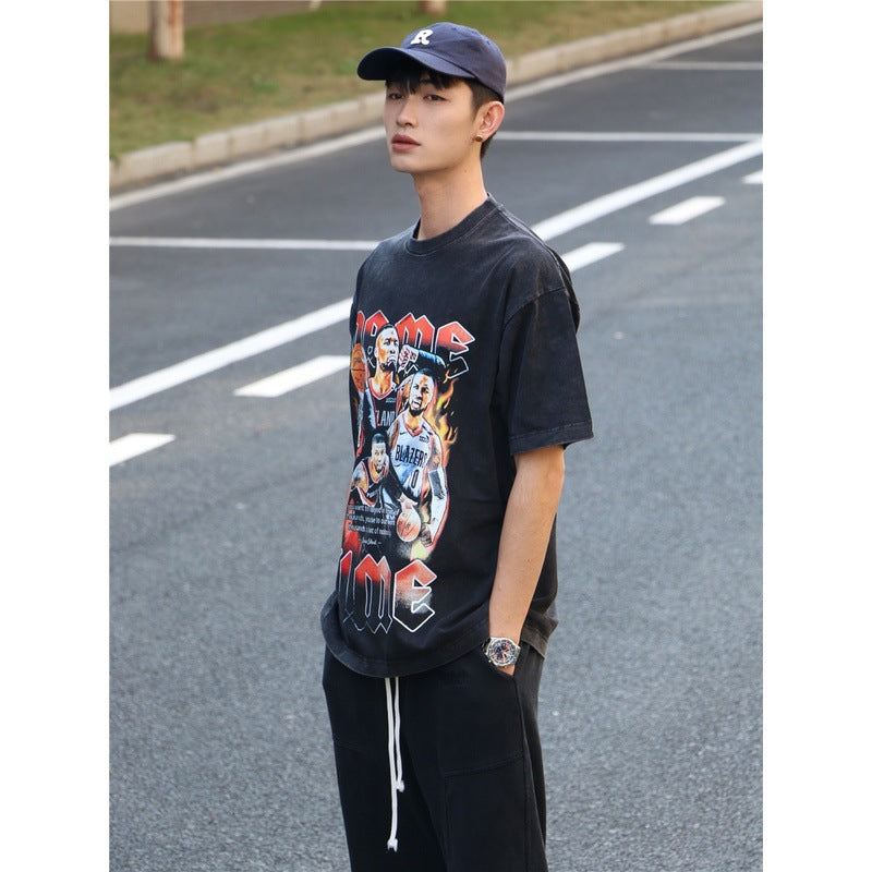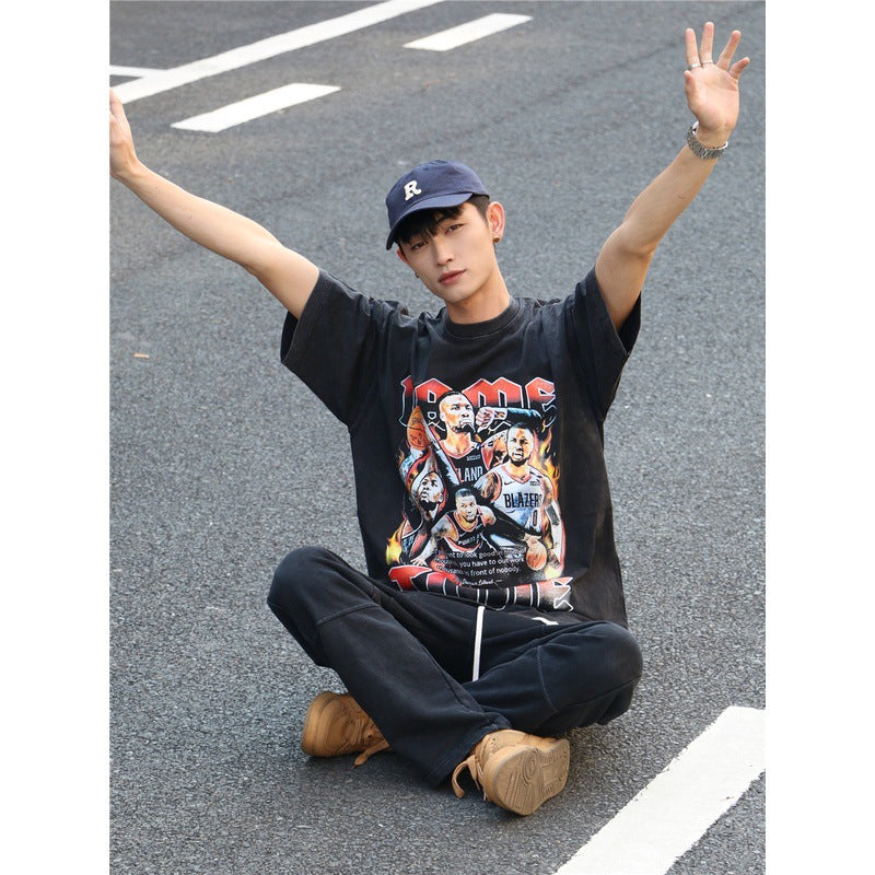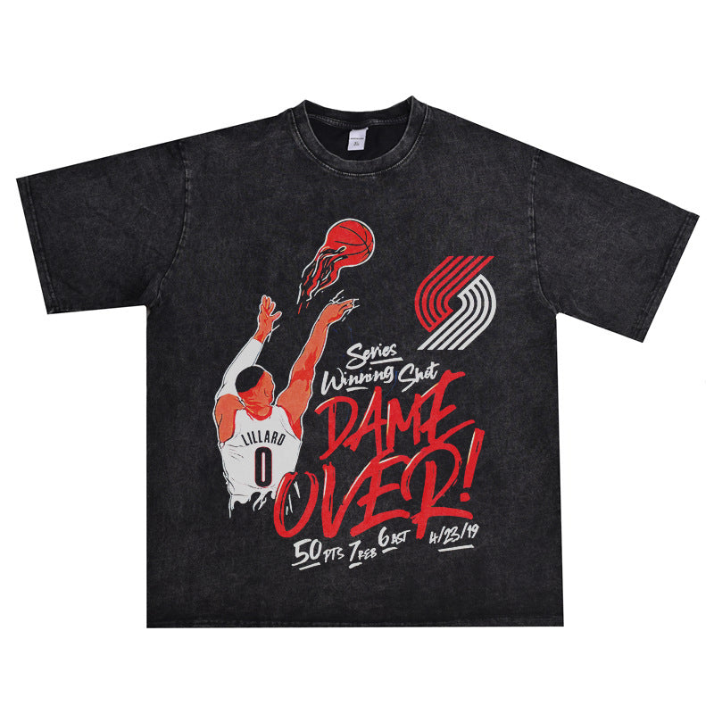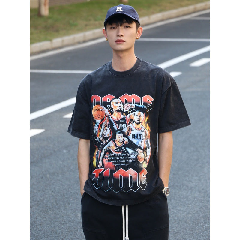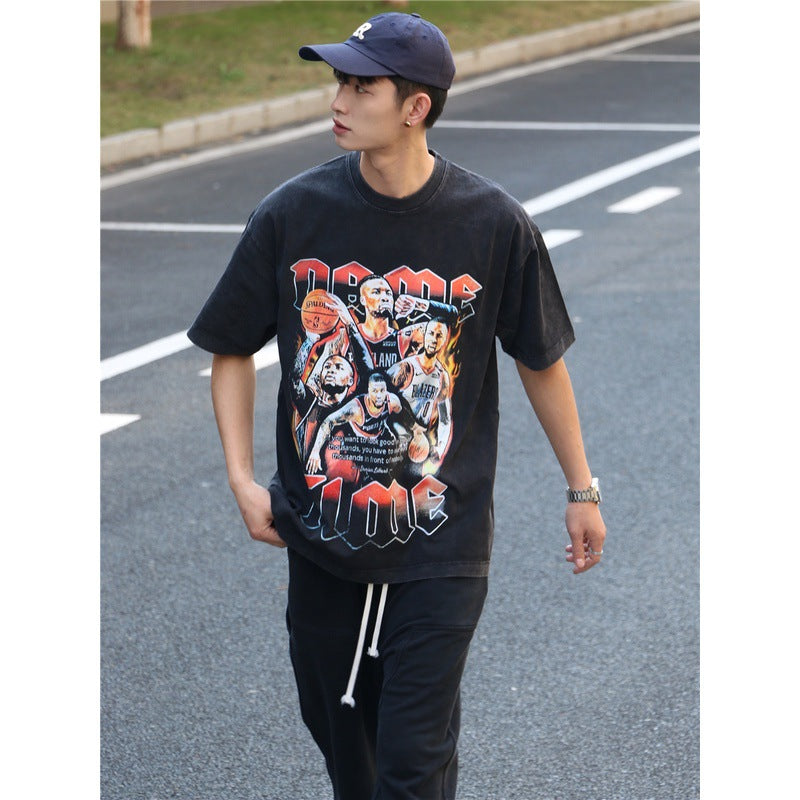 Basket Ball Star T Shirt Damian Lillard Short Sleeve Washed Distressed T-shirt Loose