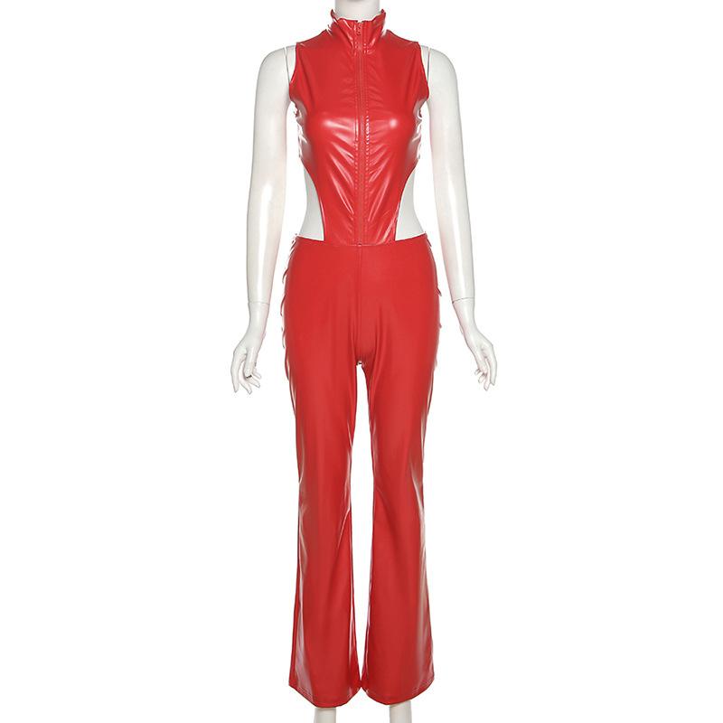 Autumn Sexy Sleeveless Zipper Hollow High Waist Tight Poly Urethane Leather Jumpsuit